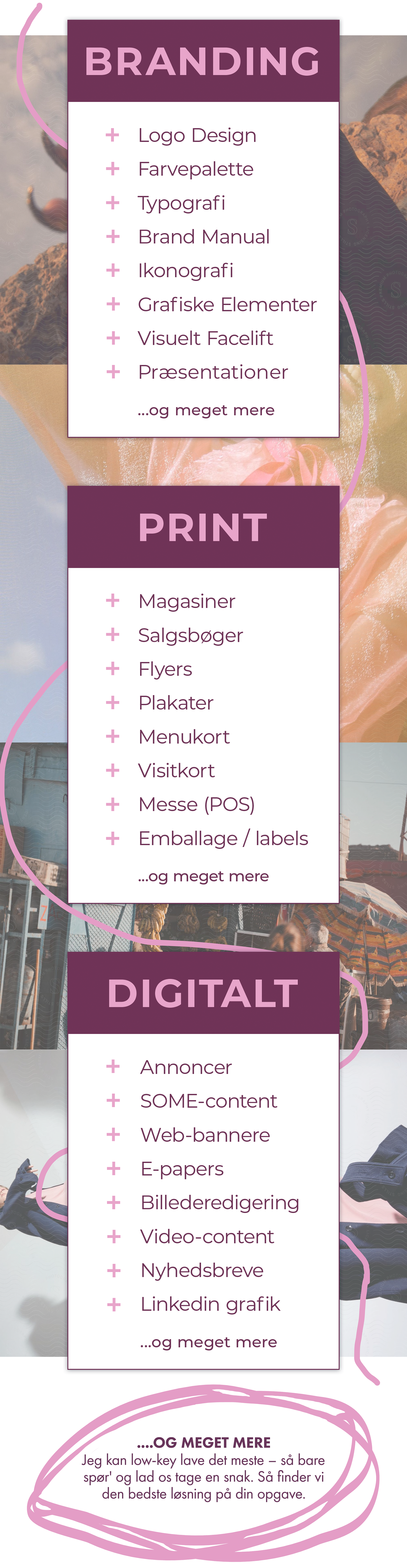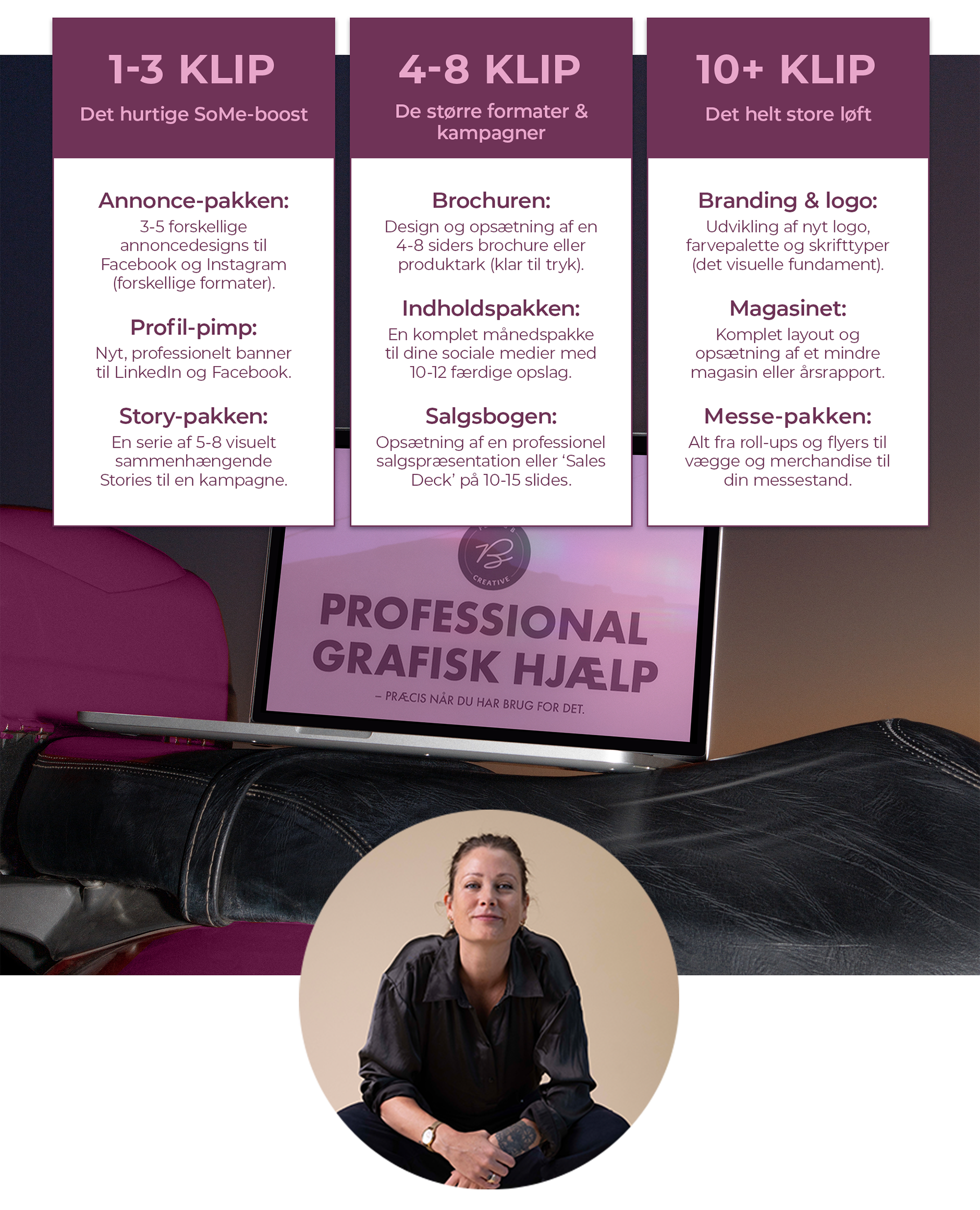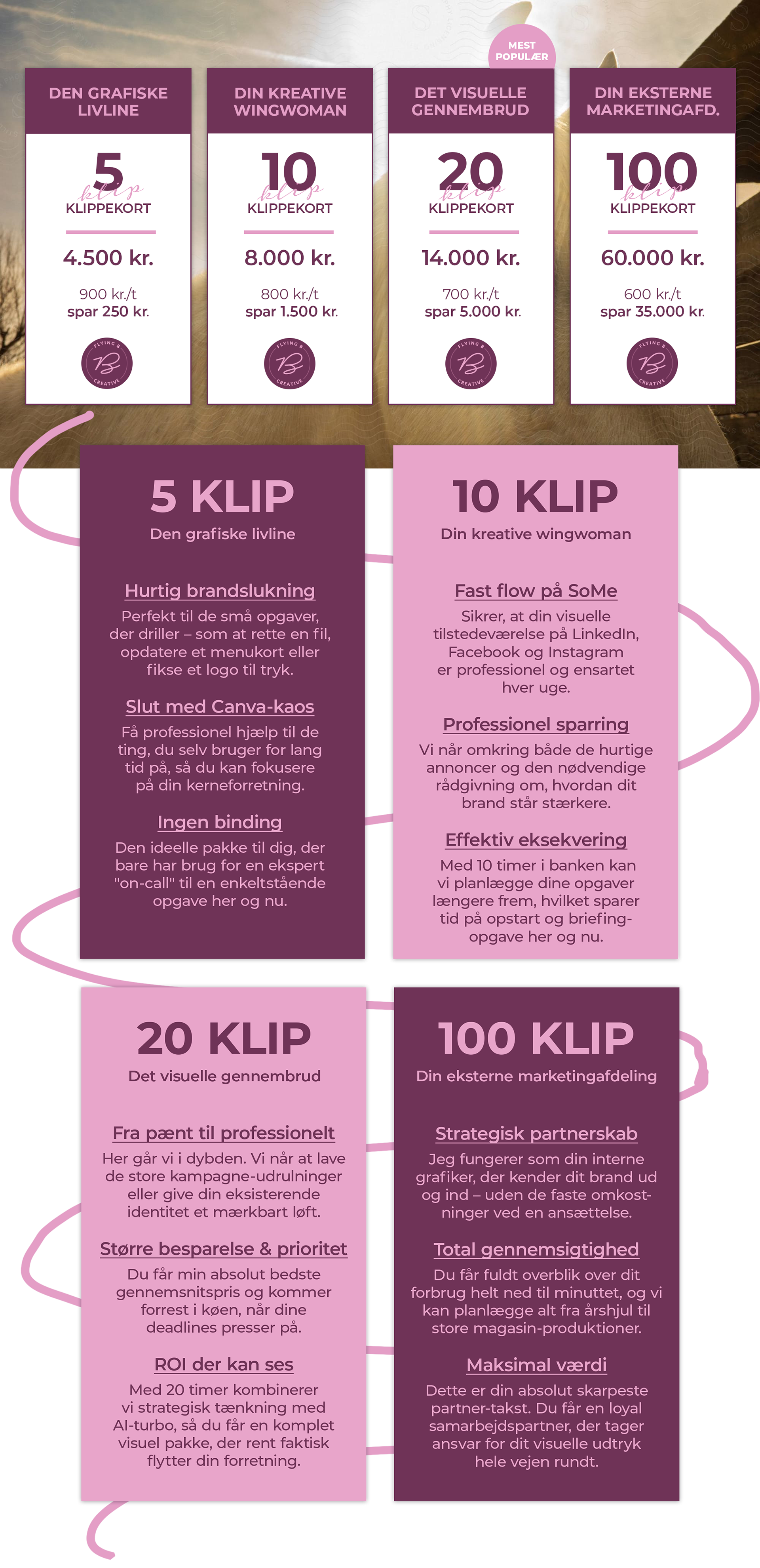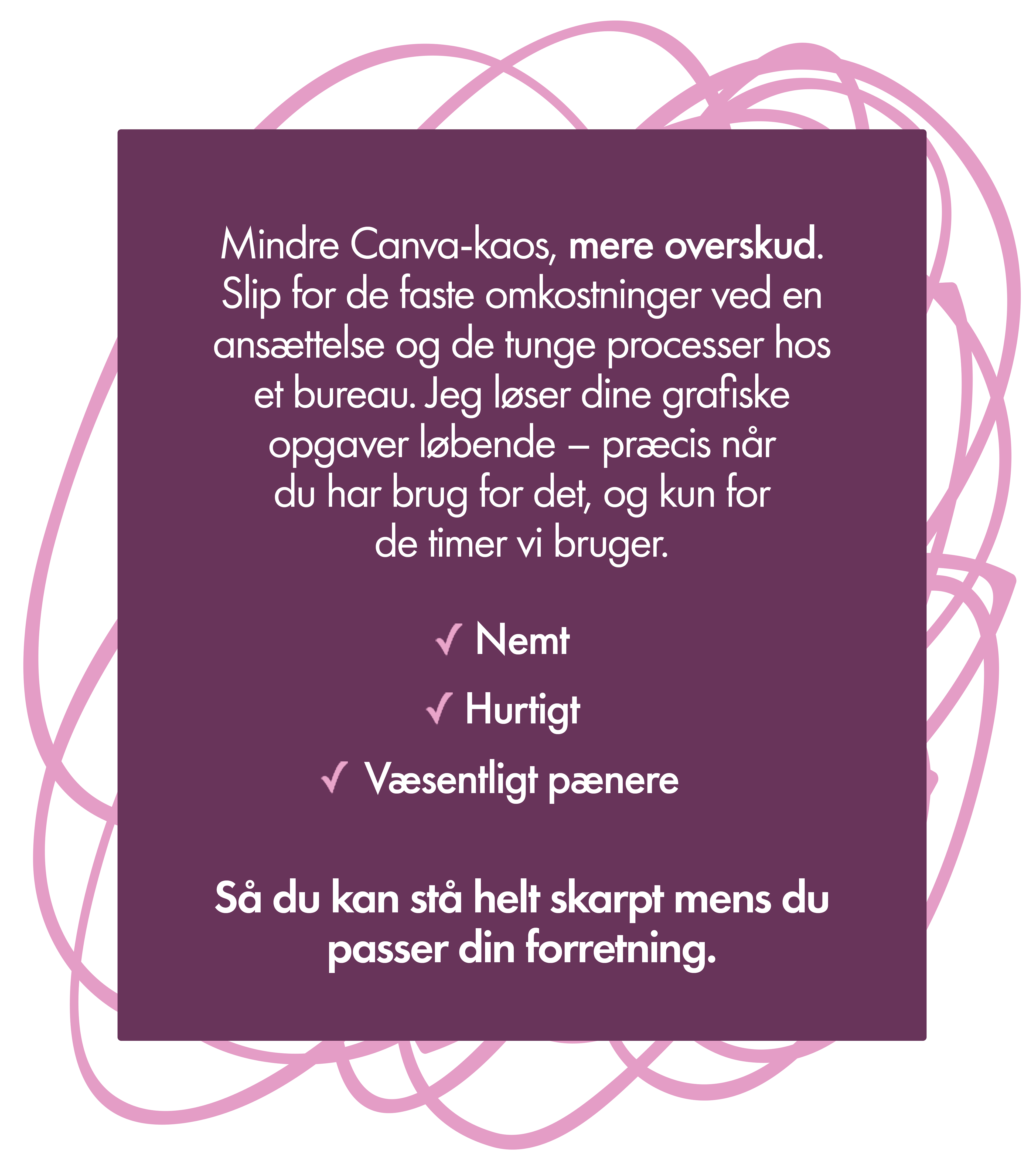Du har sikkert allerede en lille grafisk opgave liggende, som har givet dig dårlig samvittighed i ugevis. Lad os tage en kort, uforpligtende snak om dit behov, og se om et klippekort er den rette løsning for dig. Jeg lover: Ingen tunge salgstaler – bare ærlig, kreativ sparring.